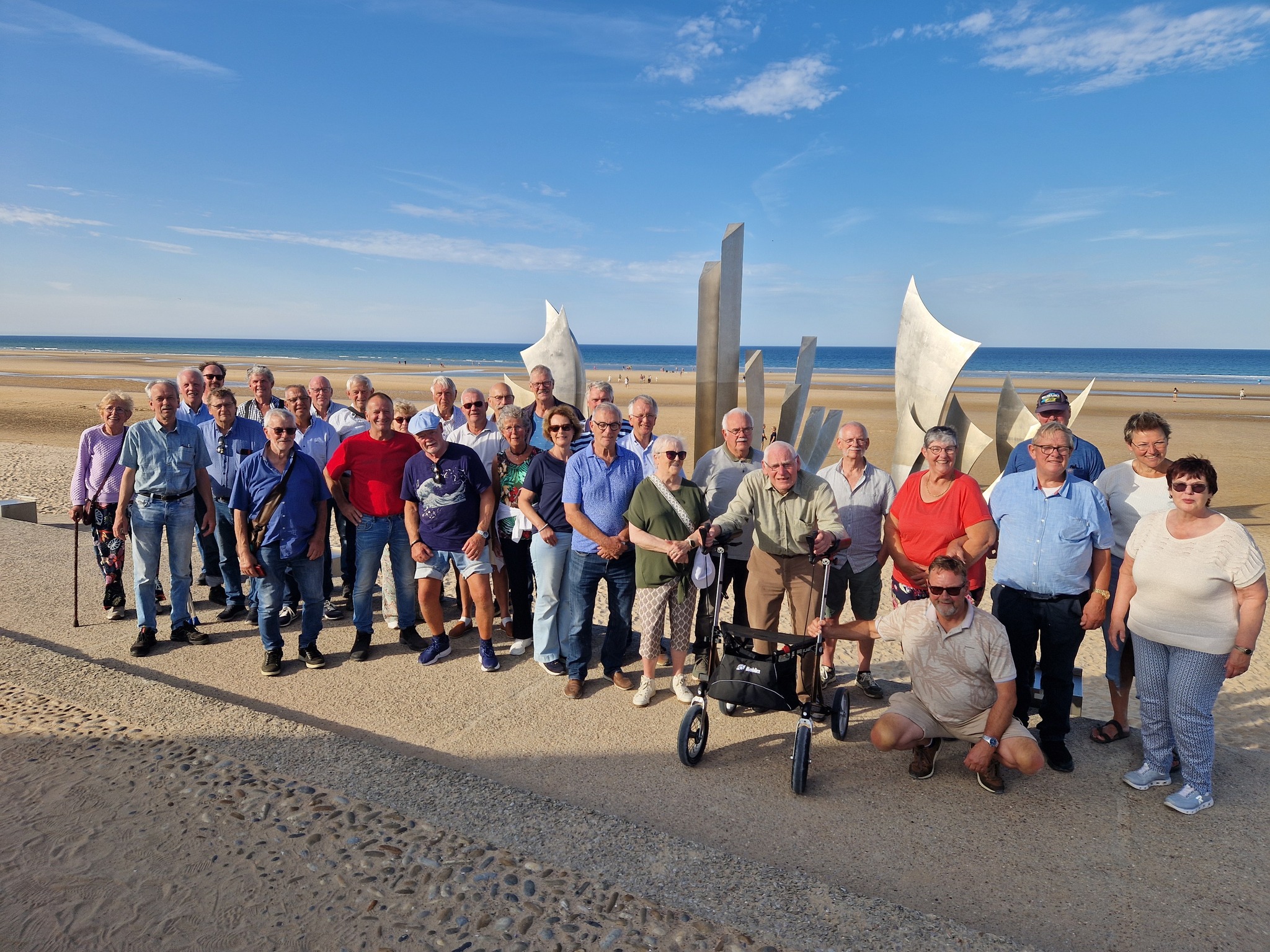 We rijden langs de kust en maken een groepsfoto bij de sculptuur die eer geeft aan de moed van de mannen die strijden voor de vrijheid. Na het diner in ons hotel blijven we nazitten. Kees heeft zijn geluidsbox opgehaald en Henk een doos met liedboeken. Dit heb ik nog nooit meegemaakt; we zingen samen uit het liedboek met de muziek uit de box. Ondertussen proosten we op de dag; une-deux-trois-Boire! Daarna komen de sterke verhalen uit de streek van het gezelschap. De barman kondigt de laatste ronde aan en dan is het ook voor ons tijd om de dag af te sluiten.